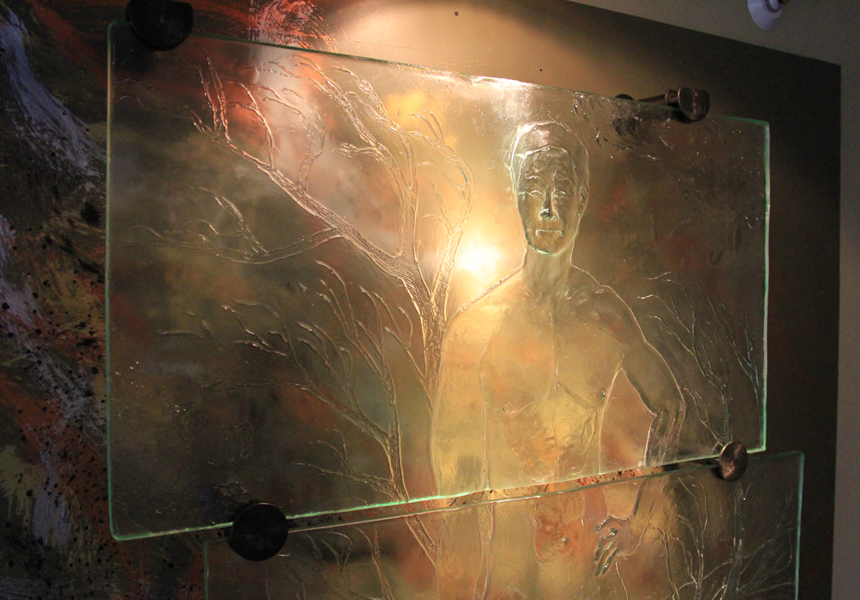 Relief, cast glass with acrylic on wood background